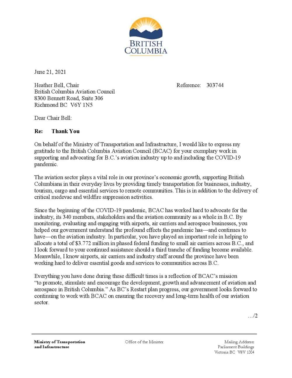 The BCAC is proud and honoured to receive this letter of thanks from the Honourable Rob Fleming, Minister of Transportation and Infrastructure, Province of British Columbia. Addressed to our Board Chair, Ms. Heather Bell, this letter acknowledges the “exemplary work in supporting and advocating for BC’s aviation industry up to and including the COVID-19 pandemic”.